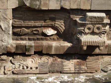 1. Hola Ofir, encontrarás unos relieves interesantes en la Piramide de Quetzalcóatl del Yacimiento de Xochicalco, Morelos, Mexico. Slds!