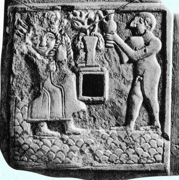 Imagen descubierta en Mesopotamia que remite fuertemente al relato bíblico: una serpiente enroscada en un árbol, señalando su fruto. Publicada por Langdon en su libro Semitic Mythology.