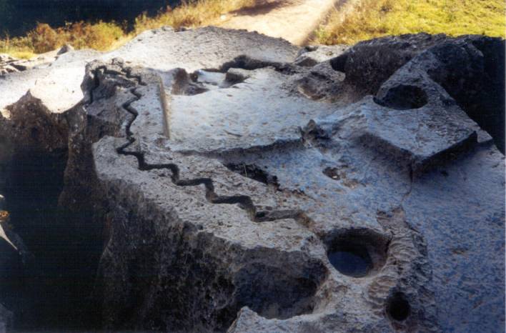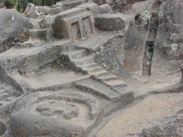 Allí, en medio de ese espacio está la gran roca de granito esculpido con grandes símbolos escalonados y unas cámaras o espacios abiertos por delante  y por arriba que semejan pequeños cubículos horadados en la roca que tal vez habrían servido  para que los sacerdotes ocupen el lugar, de pie, para hacer sus ritos o quizá para depositar sus ofrendas u otros  elementos de la parafernalia ceremonial.