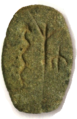 Pero lo más sorprendente de todo es una plaquita de esteatita que se ha hallado entre los guijarros de Gobekli Tepe. Mide unos cuatro centímetros de alto lleva grabados los símbolos de un árbol y una serpiente. El tercer grabado en forma de tridente no se ha identificado aún.