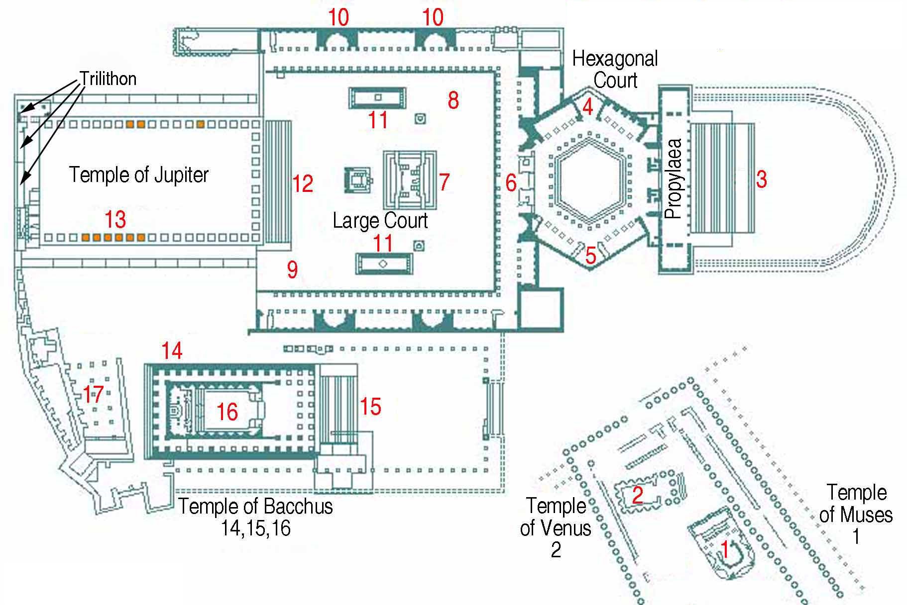 Dentro del mismo complejo se encuentran también el Templo de Baco, construido hacia el año 150 d.C. y que se haya bastante bien preservado, con 8 columnas en cada frente y 15 en cada flanco, el Templo circular de Venus, y los restos de un Templo dedicado a Hermes.