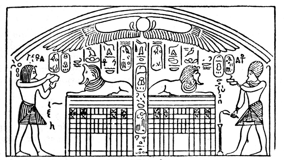 En dicho grabado, la (o las) esfinge reposa sobre lo que parece una edificación arquitectónica. La interpretación habitual afirma que el palacio grabado en la estela no es más que el templo que tiene ante si la Esfinge.