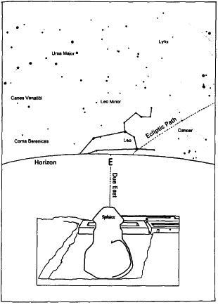 Por su parte, Robert Bauval y Graham Hancock también observaron en su libro «El guardián del Génesis» la posibilidad de que la construcción de la Esfinge esté en torno al 10500 a.e.c. Utilizando el simulador Skyglobe, que ubica las estrellas en su posición según el día y año determinado, encontraron que durante el equinoccio vernal de 10500 a. C., estando el Sol a unos 12 grados por debajo del horizonte, la Gran Esfinge miraba directamente a su contrapartida celeste, la constelación de Leo. Además, con el mismo procedimiento, observaron que las tres pirámides de Gizeh presentan la misma orientación que, en el 10500 a. C., tenían las tres estrellas del cinturón de Orión.