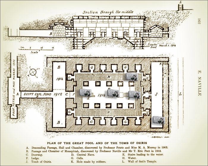 1. El Osirión fue construido unos 8 metros por debajo del nivel de los cimientos del templo de Sethy, sin razón aparente. Esto da a pensar que quizás se construyó cuando era precisamente ese el nivel del estrato superior de la tierra, y que luego con el paso del tiempo y la acumulación gradual de sedimentos, se fue elevando hasta quedar en el nivel del templo de Sethy. Esta hipótesis presupone por tanto que el Osirión es muy anterior al templo de Sethy.