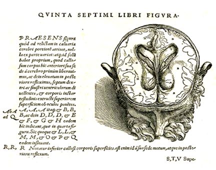 Dibujo de un texto de Vesalio (De humani corporis fabrice) en el que se representan los ventrículos laterales cerebrales.