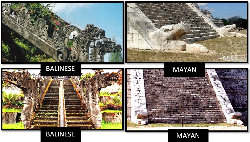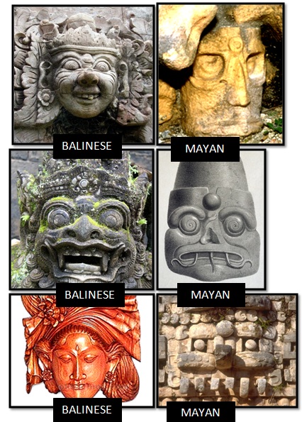 La antigua cultura de los mayas, una civilización muy avanzada que floreció en la península de Yucatán en el sureste de México, es misteriosamente similar a una cultura que floreció al otro lado del globo, en la pequeña isla de Bali, Indonesia, al sudeste de Asia. Para los estudiosos de la corriente oficial, los mayas y los balineses nunca estuvieron en contacto ya que estaban separados por el Océano Pacífico, obstáculo infranqueable por los antiguos.