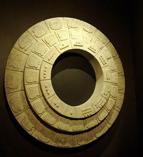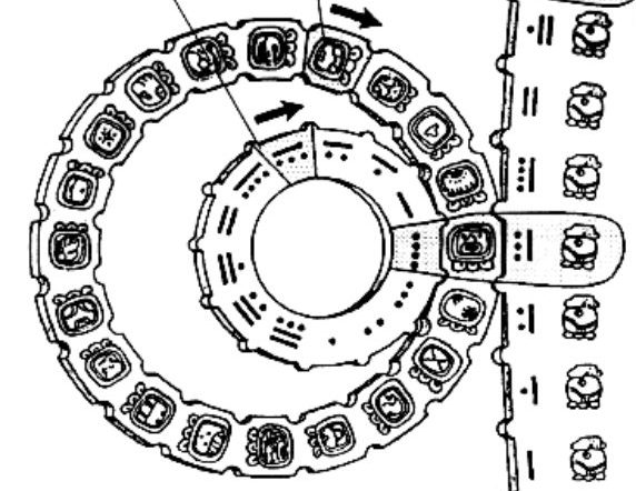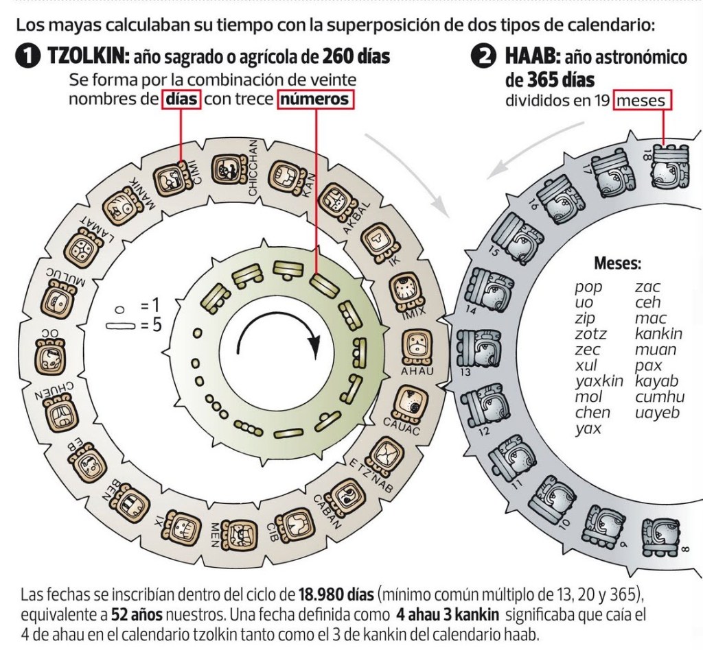 La Rueda Calendárica es la combinación de los 2 ciclos, el tzolkín (de 260 días) y el haab (de 365 días), y consiste en un ciclo de 18,980 días, o 52 años gregorianos.