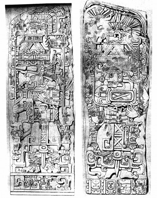 En la Estela 5 se observa sobre el costado inferior derecho la creación de los seres de barro, junto al pie del árbol los seres de madera que carecieron de rostro y en la parte superior izquierda a un representante de los seres de maíz justo en el momento de recibir sobre su rostro el hálito divino que parcialmente los cegó.