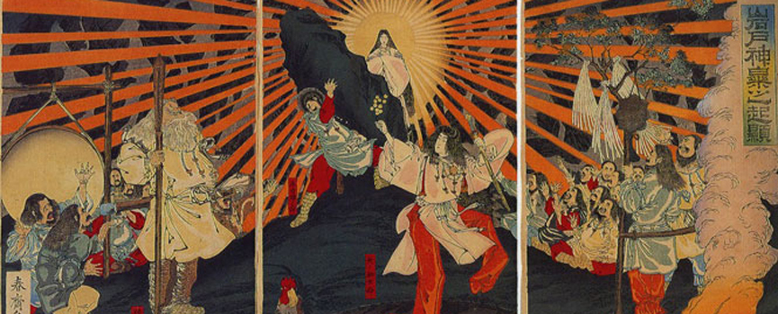 El resto de dioses intentaron convencerla para que saliese de la cueva pero ella se negó, por lo que idearon un plan para hacerla salir. Fabricaron un gran espejo y unas joyas que colocaron en un árbol frente a la cueva, y la diosa Uzume bailó desnuda, provocando el jolgorio del resto de dioses, unos ocho millones en total.