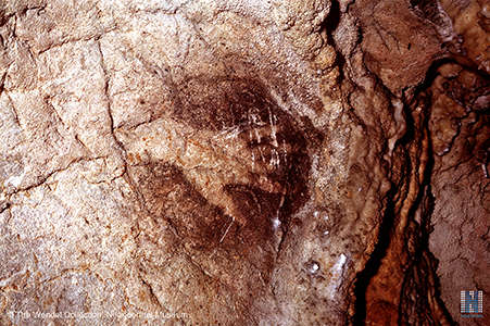 Gruta de Pech Merle, Francia: ubicada en el departamento de Lot en la región de los Pirineos, representa uno de los lugares más importantes del arte paleolítico en Europa. La plantilla de la mano en negativo, en rojo ocre, tiene unos 25.000 años AEC.
