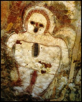 De todas la figuras, destaca una que representa a un hombre, vestido desde los pies hasta la cabeza con una túnica de color rosa, con un circulo doble rodeando su cabeza, también de color rosa y oro, y sobre la zona de color rosa aparece una serie de marcas que se asemejan a una especie de inscripción.