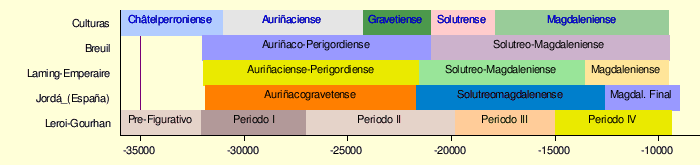 La datación de estas figuras atraviesan los períodos Auriñaciense, Gravetiense y Solutrense, que es cuando predominan las formas obesas. Siguieron elaborándose hasta el Magdaleniense, pero en estos periodos ya adquieren una forma delgada con cambios en las zonas de interés: se detalla la cara, o han, evolucionando hacia formas cada vez más estilizadas, incluso abstractas (venus claviformes).