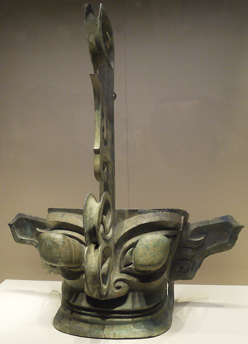 Los hallazgos más llamativos fueron grandes máscaras y cabezas de bronce (con máscaras cubiertas de láminas de oro) representadas con rasgos humanos angulosos y ojos oblicuos enormes, algunos con pupilas oculares salientes y grandes orejas. A partir del diseño de estas cabezas, los arqueólogos creen que se colocaban encima de soportes de madera tótems, quizá cubiertos de ropa. Algunas de las máscaras son enormes. Una mide unos increíbles 1,32 metros de altura y 0,72 metros de ancho, la máscara más grande de bronce que se haya encontrado.