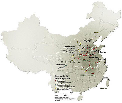 Además de Sanxingdui, otros descubrimientos arqueológicos en Sichuan incluyen las culturas Baodun y Jinsha. Los restos de estas culturas independientes en diferentes regiones de China desafían la teoría tradicional por la que el río Amarillo fue la única «cuna de la civilización china».