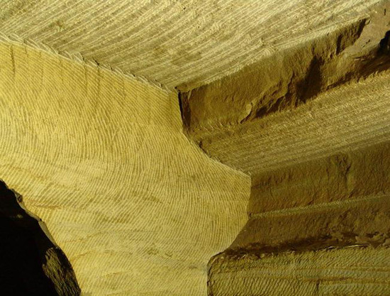 Las superficies interiores (techo, paredes y pilares) están minuciosamente cinceladas de la misma manera, con una serie de estrías paralelas en un ángulo de unos 60°. Algunos expertos creen que dicho patrón es simbólico.