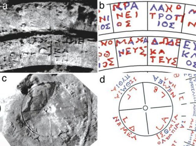 Reconstruction of the Olympiad Dial on the Antikythera Mechanism. Imagen: ©2008 Tony Freeth. Figure Caption: The right-hand subsidiary dial is an Olympiad Dial, showing the four-year cycle of Panhellenic Games. In Year 1 are the Isthmian Games in Corinth and the Olympic Games in Olympia; in year 2 are the Nemean Games in Nemea and the Naian Games in Dodona; in Year 3 are the Isthmian Games in Corinth and the Pithian Games in Delphi; in Year 4 are the Nemean Games in Nemea and an undeciphered game.