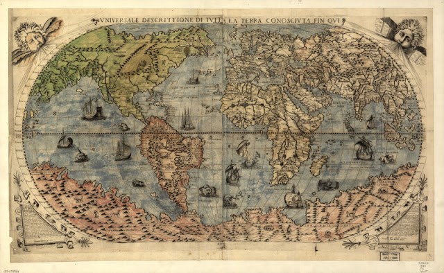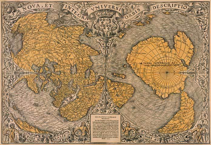 La copia de Paolo Forlani de 1565 del mapamundi de Giacomo Gastaldi de 1546 tiene como aspecto más destacable, junto a la decidida seguridad con la que prolonga por el noroeste el continente americano para unirlo con las Indias Orientales, la representación del gran continente austral desconocido.