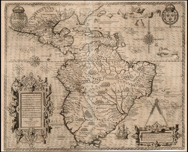 Mapa de Sudamérica de Theodore de Bry de 1592. Este mapa refleja la falta de las proporciones correctas que todavía tenía la cartografía a cien años después de la llegada de los europeos a América.