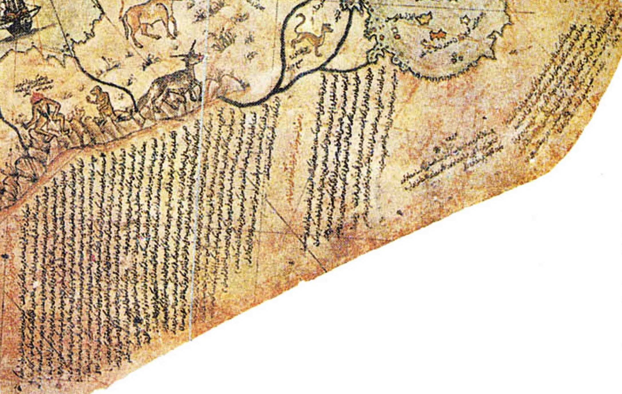 - «cartas marítimas dibujadas en la época de Alejandro Magno…que muestran la inhabitada cuarta parte del mundo». Acaso Piri Reis está diciendo que hacia el 330 AEC ya se conocía la existencia de (la actual) América?