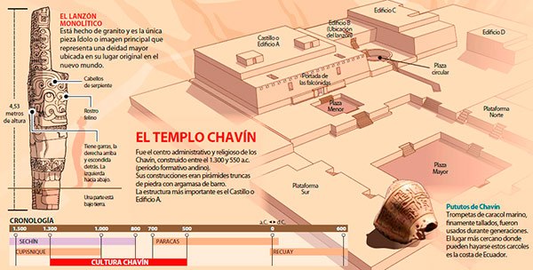 En su máximo apogeo, Chavín de Huántar fue un importante centro ceremonial y centro de irradiación cultural cuya influencia se extendió por gran parte de la costa y sierra de los andes peruanos.