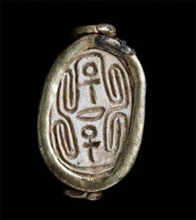 Otro de los objetos del tesoro consiste en un escarabajo egipcio recubierto de oro datado de la época Hyksos. El mismo lleva grabado dos símbolos del ankh (☥), un jeroglífico que significa «vida» en esa cultura.