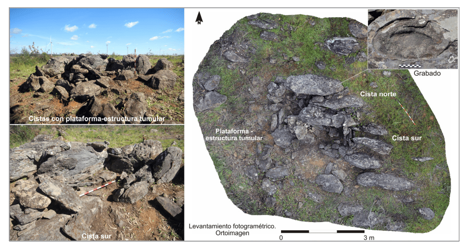 Por su parte, los túmulos de piedra poseen distintas longitudes, entre los 6 y 17 metros, y presentan estelas asociadas. Se han documentado, además, 41 cistas individuales o para dos o más individuos. Son estructuras rectangulares de entre 1 y 2,5 metros de longitud talladas en piedra.