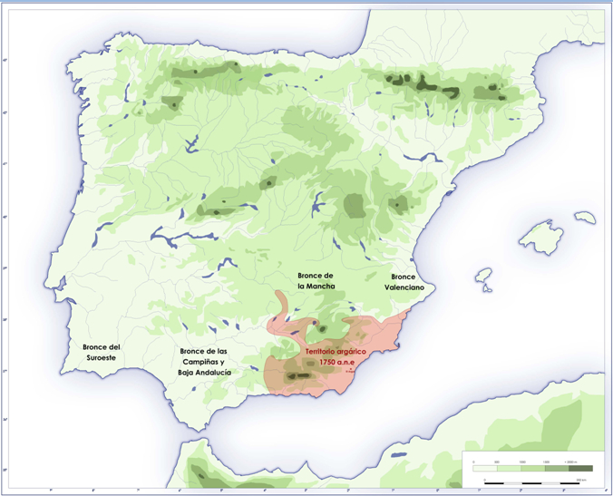 La cultura argárica se extendió unos 700 años (2200 a 1550 AEC), fue escasamente permeable y se basaba en relaciones de parentesco y un sistema de transmisión hereditaria. El Argar comenzó entre las cuencas de Vera y Guadalentín (Murcia) y se extendió por la Meseta, la Comunidad Valenciana, Almería y Granada.