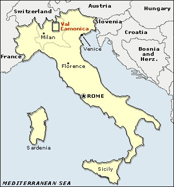 Estos petroglifos se tratan de incisiones realizadas sobre la roca del valle italiano de Val Camonica, que se encuentra en la provincia de Brescia. La Val Camonica (o también Valcamonica, en los dialectos camunios: Al Camònega) es uno de los valles más extensos de los Alpes, cerca de 90 km de largo con 1347 km².