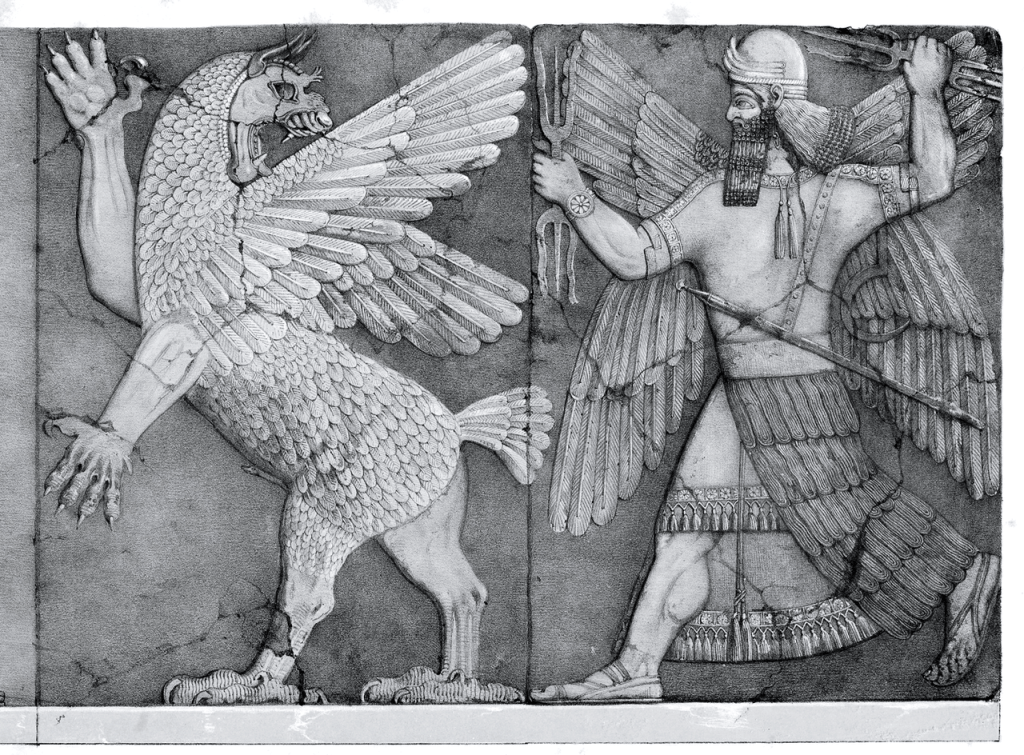 Ninurta con sus rayos persigue a Anzû robando la Tablilla de los destinos del santuario de Enlil. (Austen Henry Layard Monuments of Nineveh, 2ª Serie, 1853). Imagen