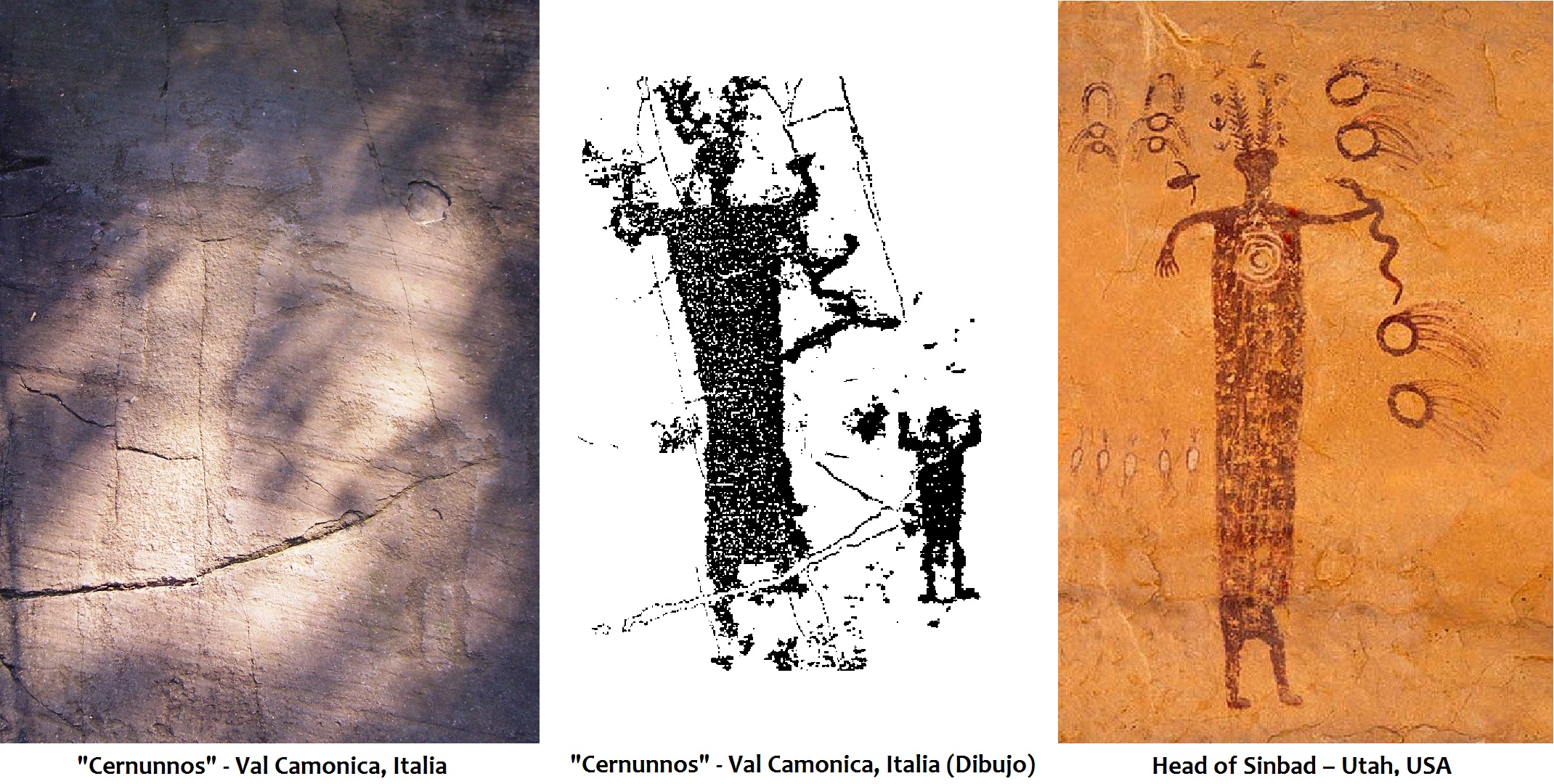 Entre la serie de figuras antropomórficas, encuentro asombrosamente parecidos a dos personajes, uno proveniente de Val Camónica, Italia y el otro de Utah, USA de la cultura Anasazi. Se trata en ambos casos de una persona de figura muy alargada, con astas con puntas y una serpiente en su mano izquierda: