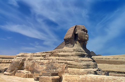 3. La Gran Esfinge: No se trata de un monumento construido sino excavado. El terreno pétreo fue desalojado convenientemente para que al final emergiera el cuerpo del animal dentro del foso de la roca madre. En las paredes de este foso se aprecia la erosión acuática producida por la lluvia en un periodo húmedo anterior a que Egipto se desertizara, fecha que debe ser más antigua de los 10000 años. Y si la IV Dinastía no llega a los 5000 años de antigüedad, ¿quién la construyó?